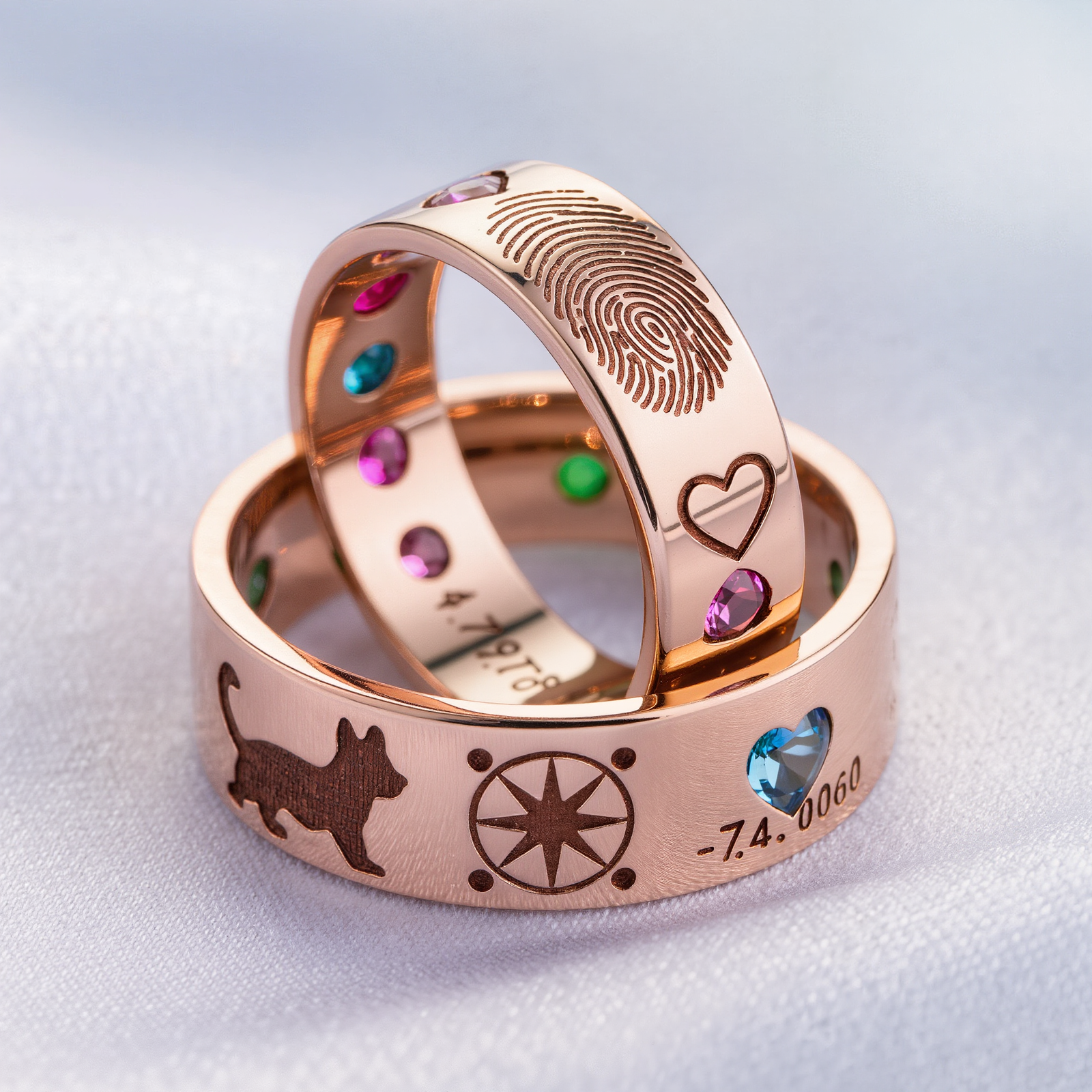 【Secret Series】· Concept: Carve the secrets shared between two into visible romance. · Design Features: · Inner Band Engraving: Use micro-setting techniques to embed one or several colored gemstones (such as birthstones for anniversaries) or engrave Morse code on the inner band of the ring. · Fingerprint Element: Laser-engrave the partner’s fingerprint on the inner side of the ring band, creating the most intimate touch. · Custom Totem: Design a unique symbol based on the couple’s story (such as the coordinates of their first meeting or the outline of a pet) and incorporate it into the ring’s setting.