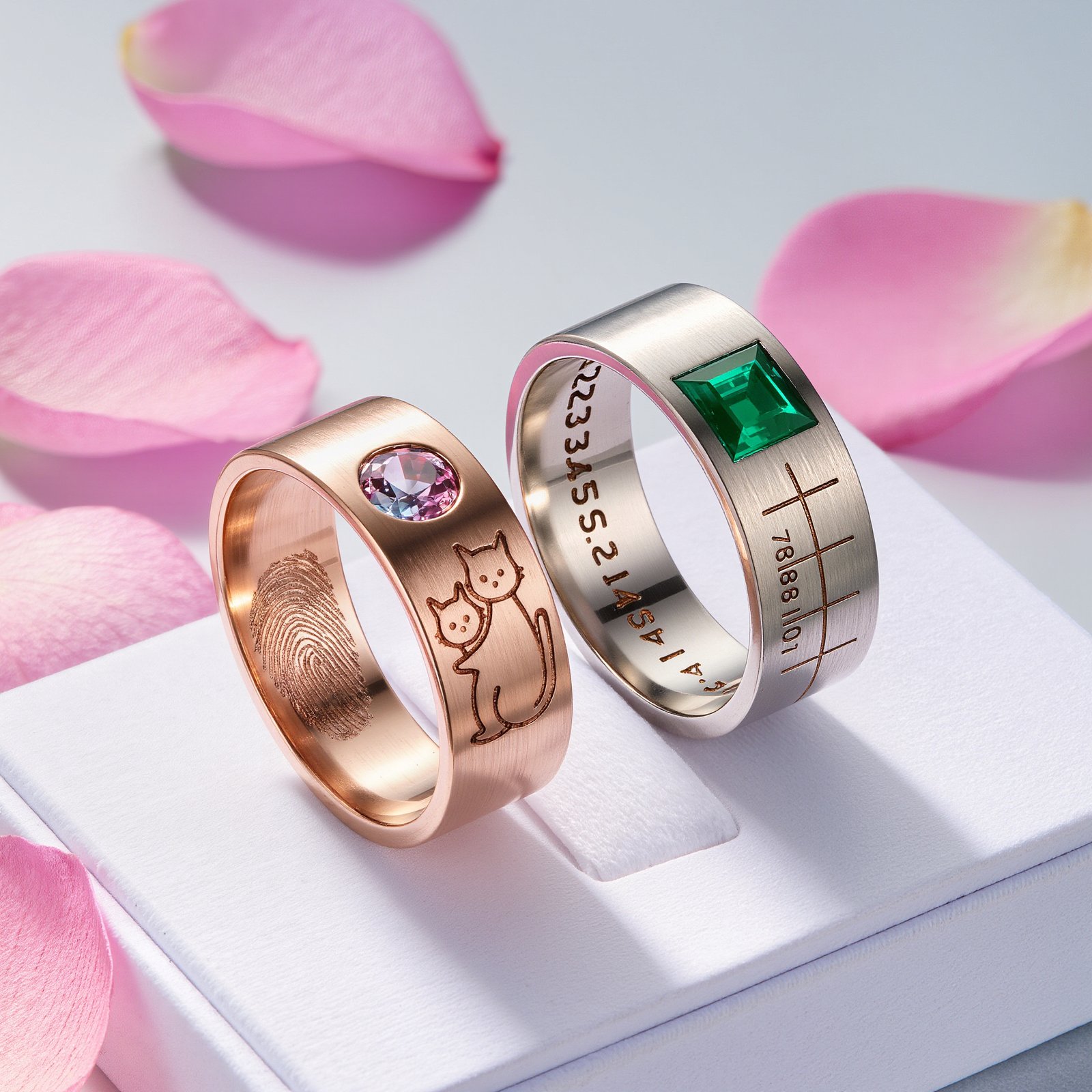 【Secret Series】· Concept: Carve the secrets shared between two into visible romance. · Design Features: · Inner Band Engraving: Use micro-setting techniques to embed one or several colored gemstones (such as birthstones for anniversaries) or engrave Morse code on the inner band of the ring. · Fingerprint Element: Laser-engrave the partner’s fingerprint on the inner side of the ring band, creating the most intimate touch. · Custom Totem: Design a unique symbol based on the couple’s story (such as the coordinates of their first meeting or the outline of a pet) and incorporate it into the ring’s setting.