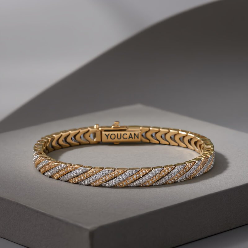 9k gold tricolor interwoven bracelet (symbolizing diverse self), each buckle is set with cultivated diamonds