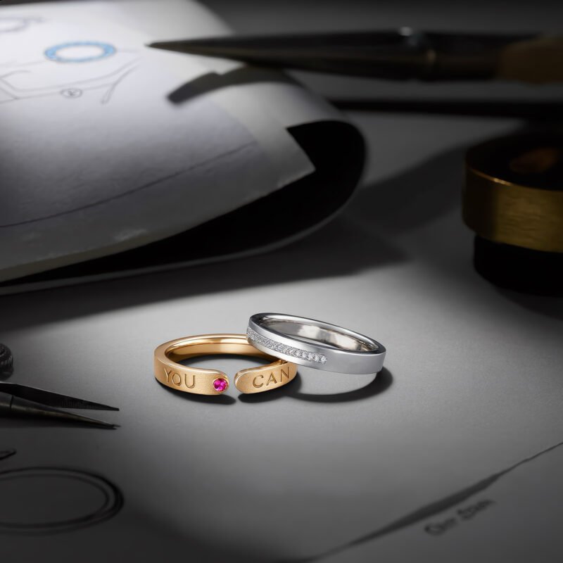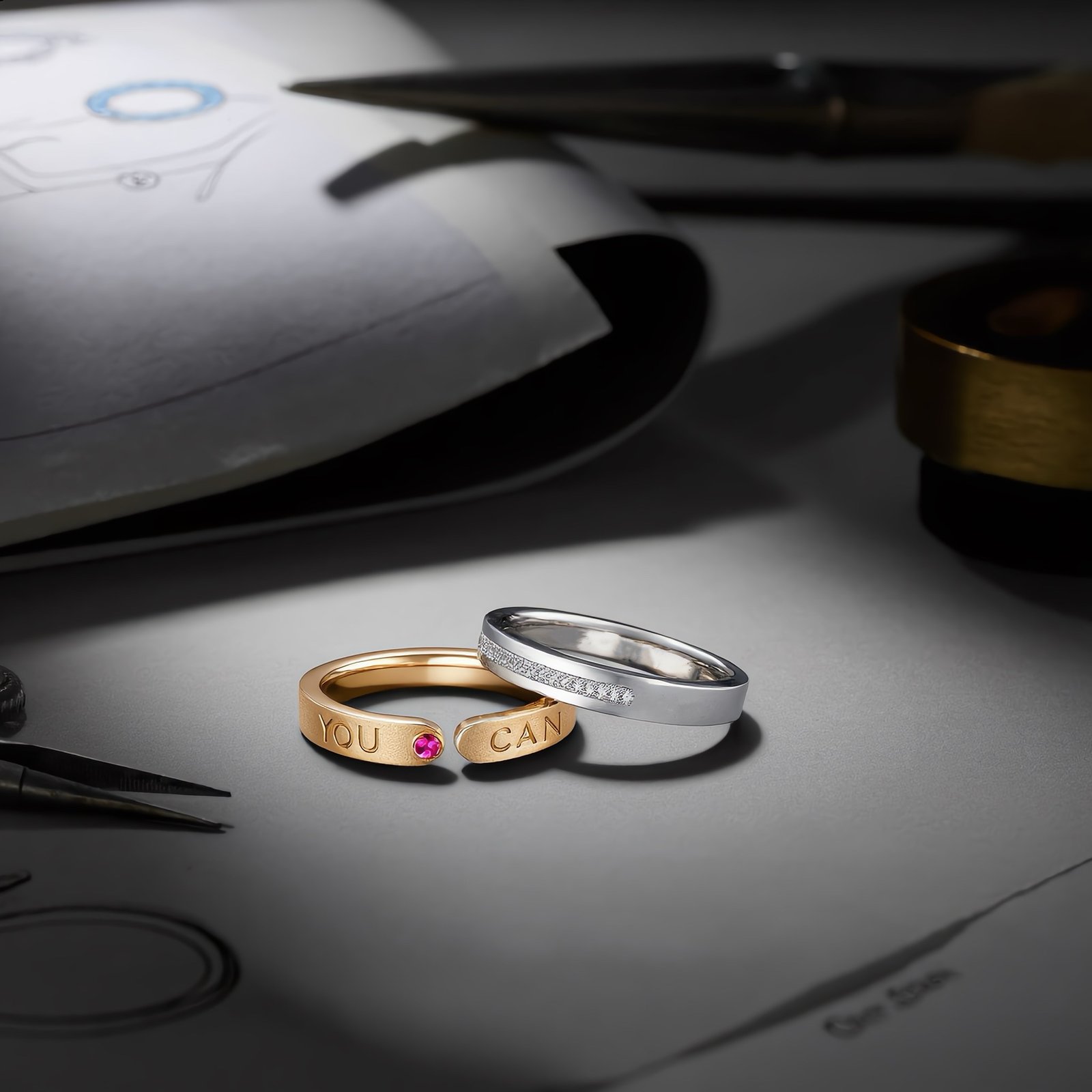 Ring in 18K yellow gold set with rubies and white gold with lab-grown diamonds The ring is engraved with the word “YOUCAN” to symbolize the promise between couples