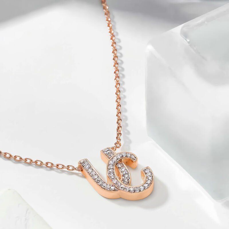 The necklace is made of 18K rose gold color, with the letters U and C selected for combination and inlaid with tiny cultivated diamonds to make the necklace shine brightly